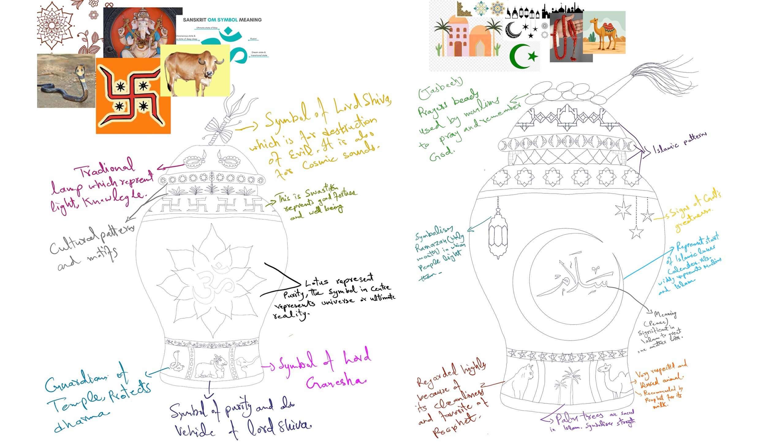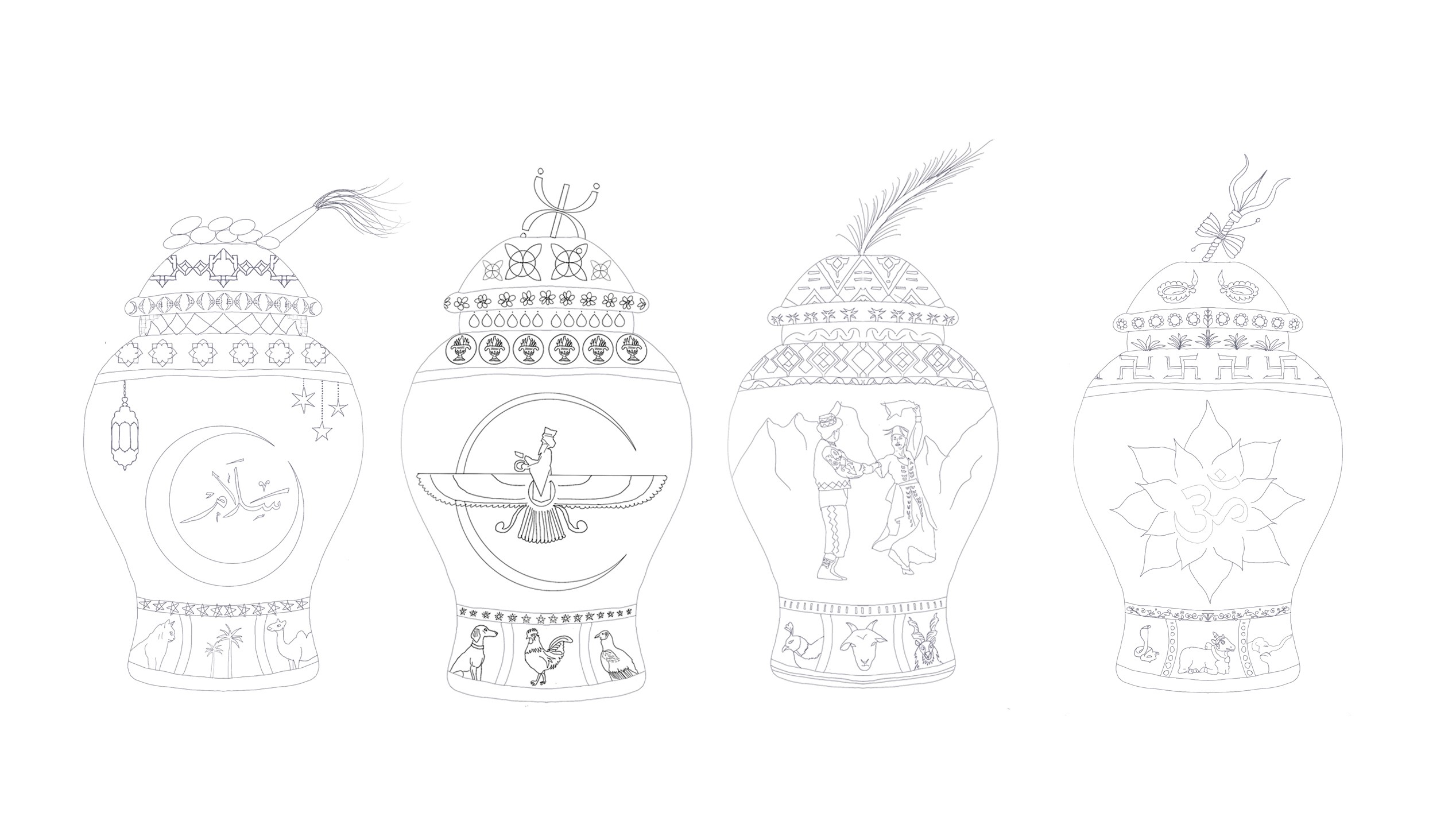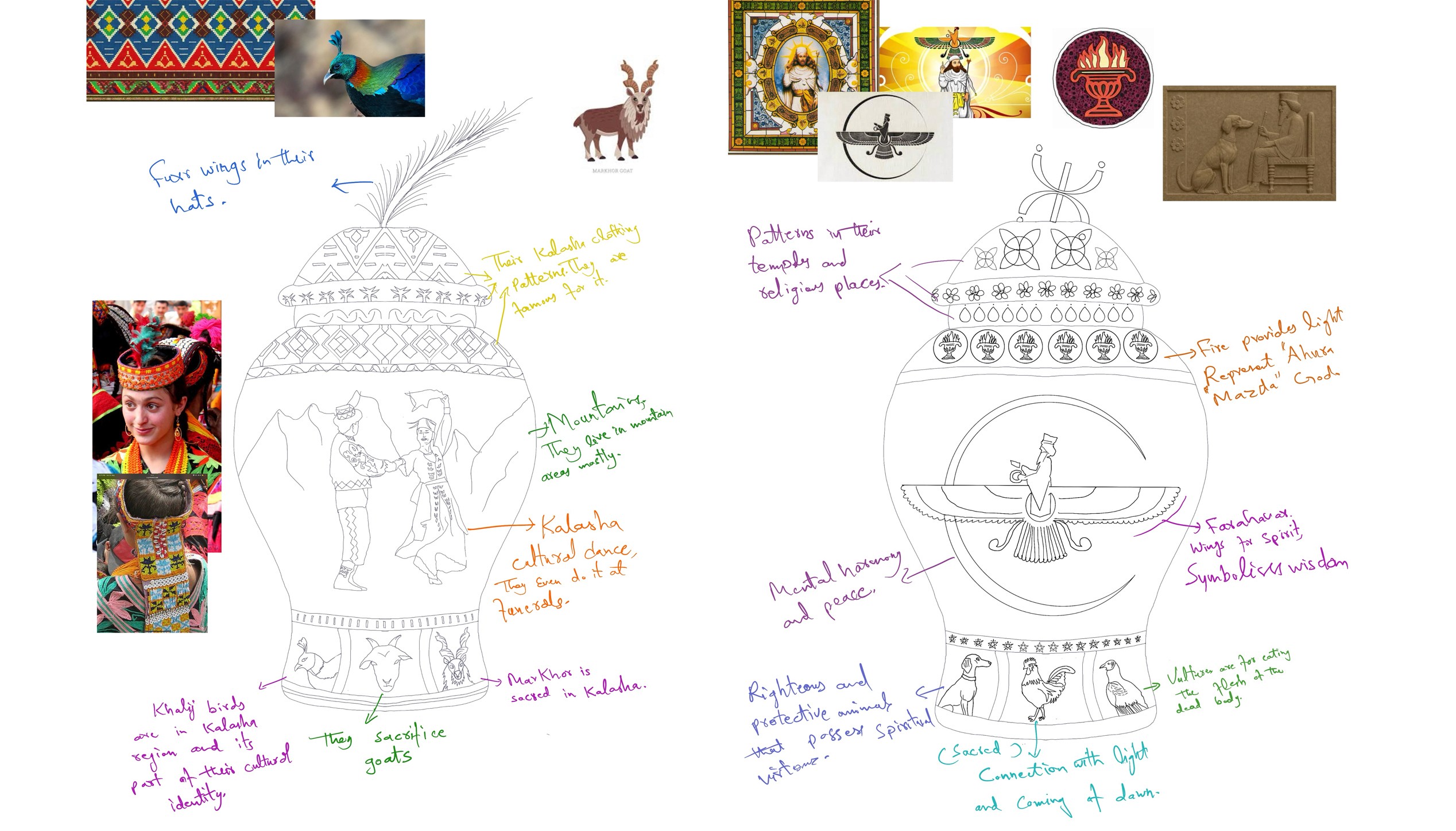 This project is inspired by the idea that “the body is a vessel, and the soul is the traveller.” It features four illustrated vases, each representing a different culture and religion from the Indian subcontinent—Kalasha, Hinduism, Zoroastrianism, and Islam. Each vase is decorated with symbolic patterns, motifs, and animals drawn from its tradition, reflecting unique ways of honouring the dead. The forms are left slightly open to suggest the soul’s departure, while the remaining details act as traces of memory and identity. The work explores how culture and beauty continue to exist beyond death, leaving behind lasting imprints of who we are.